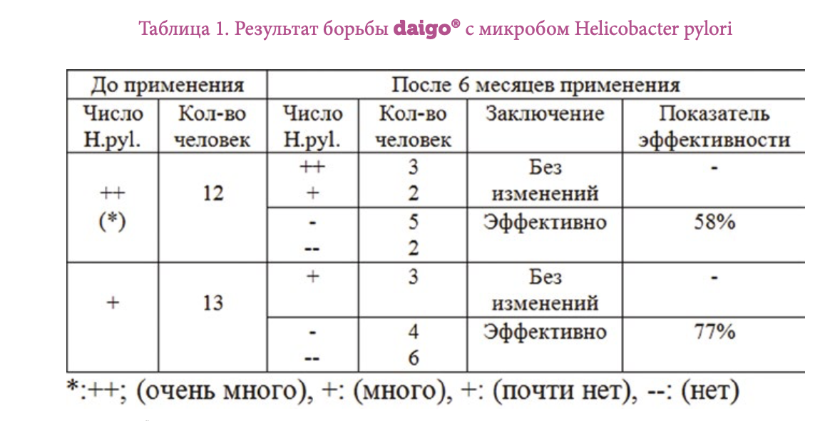 По истечении 6-месячного приема препарата daigo было установлено, что из 25 человек у 68% (17 человек) испытуемых микроб ликвидирован, тем самым было подтверждено, что daigo способен ликвидировать Helicobacter pylori.Если сравнивать daigo с ингибиторами протонного насоса, антибиотиками и прочими медикаментами, то в отличие от последних продукт daigo не имеет никаких побочных эффектов в виде колик, диареи, потери чувства вкуса и т.д.
